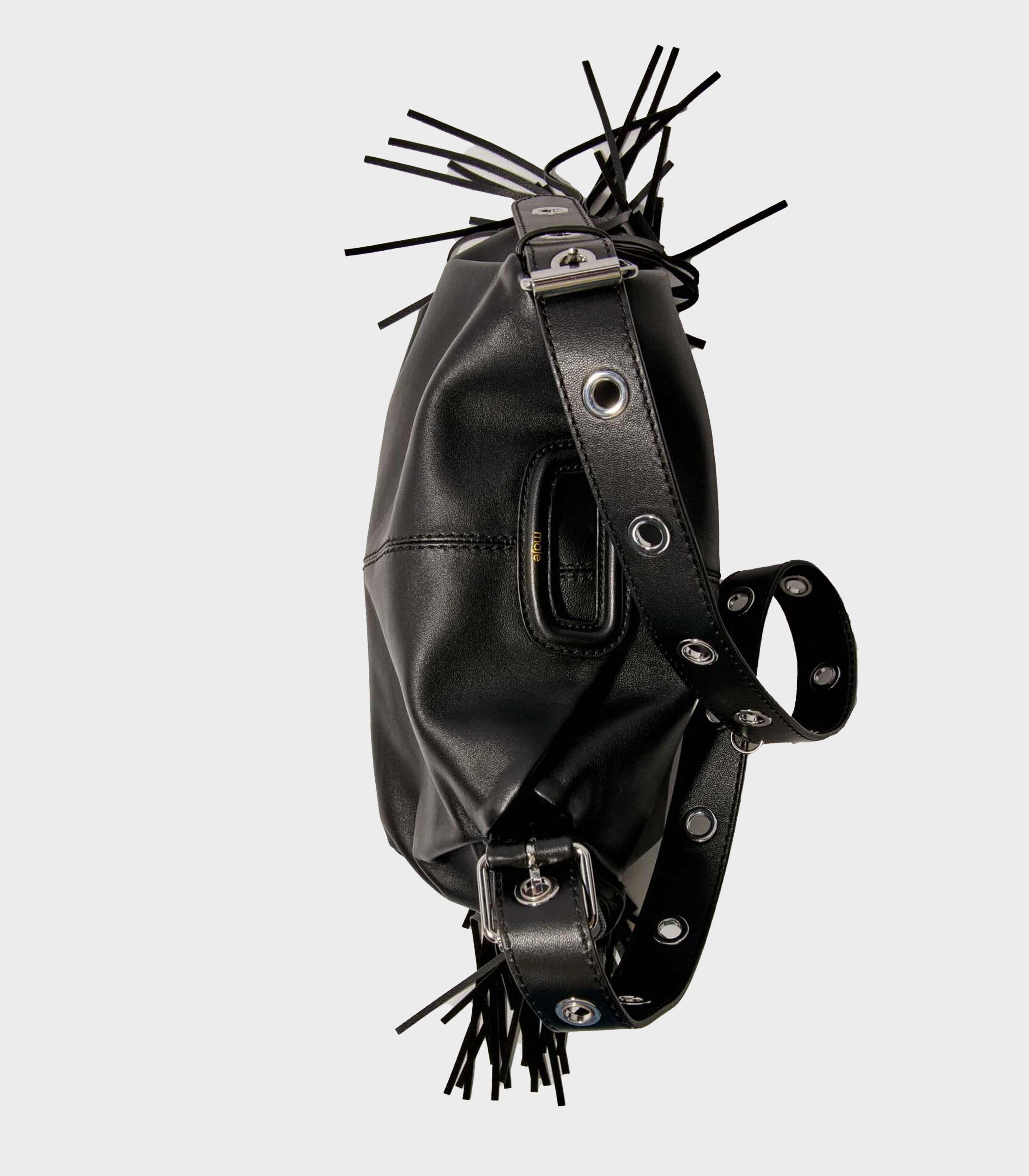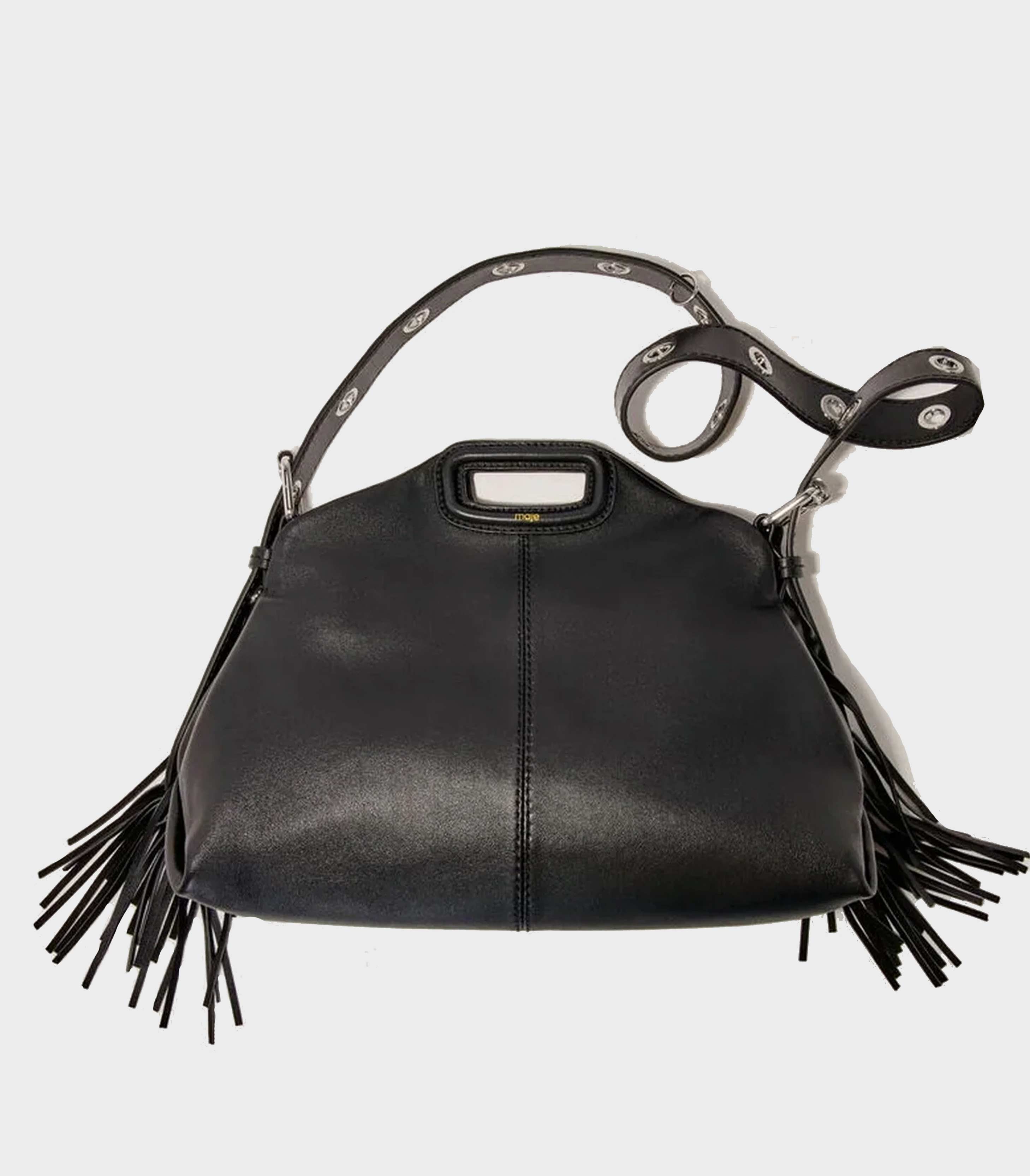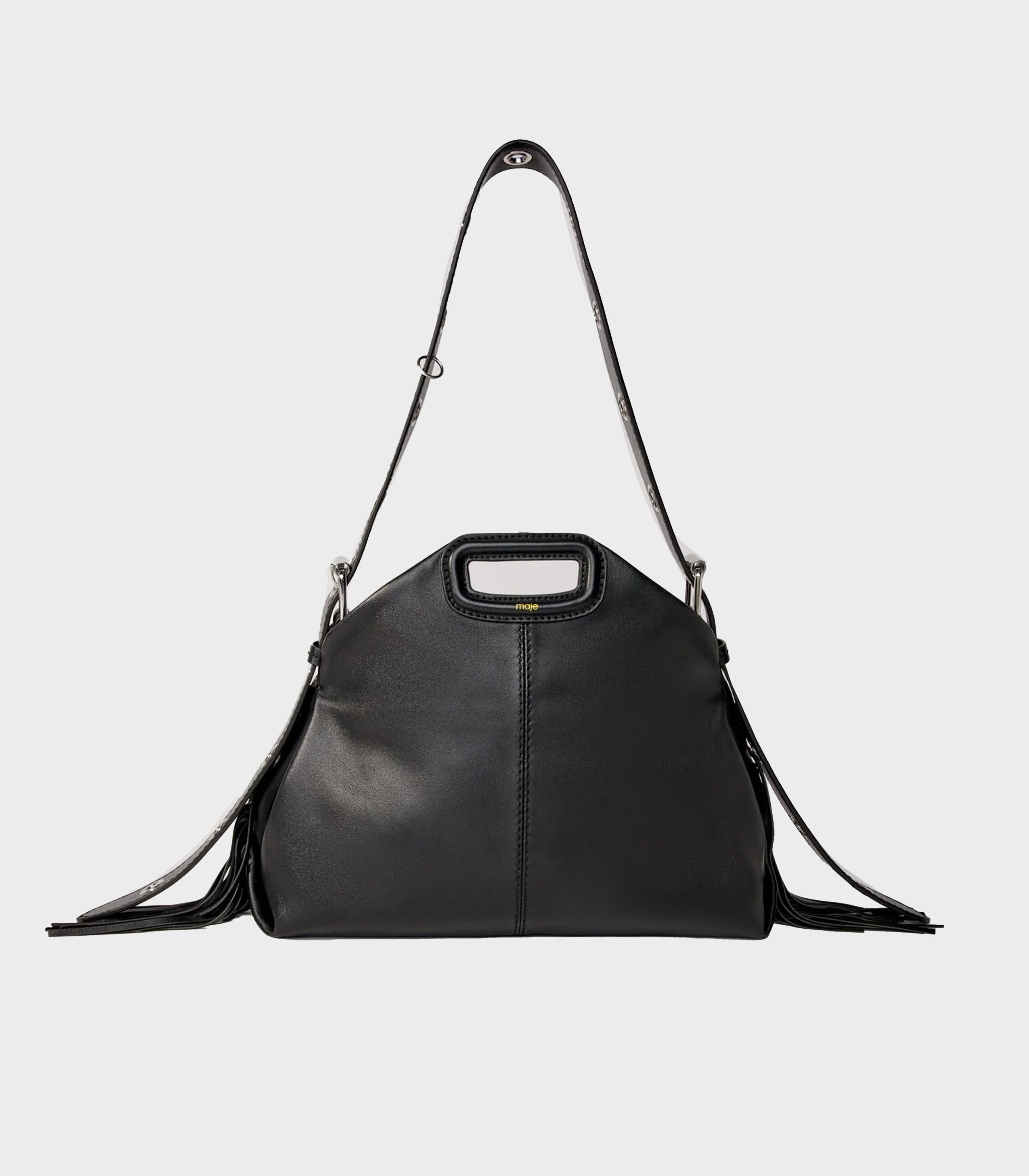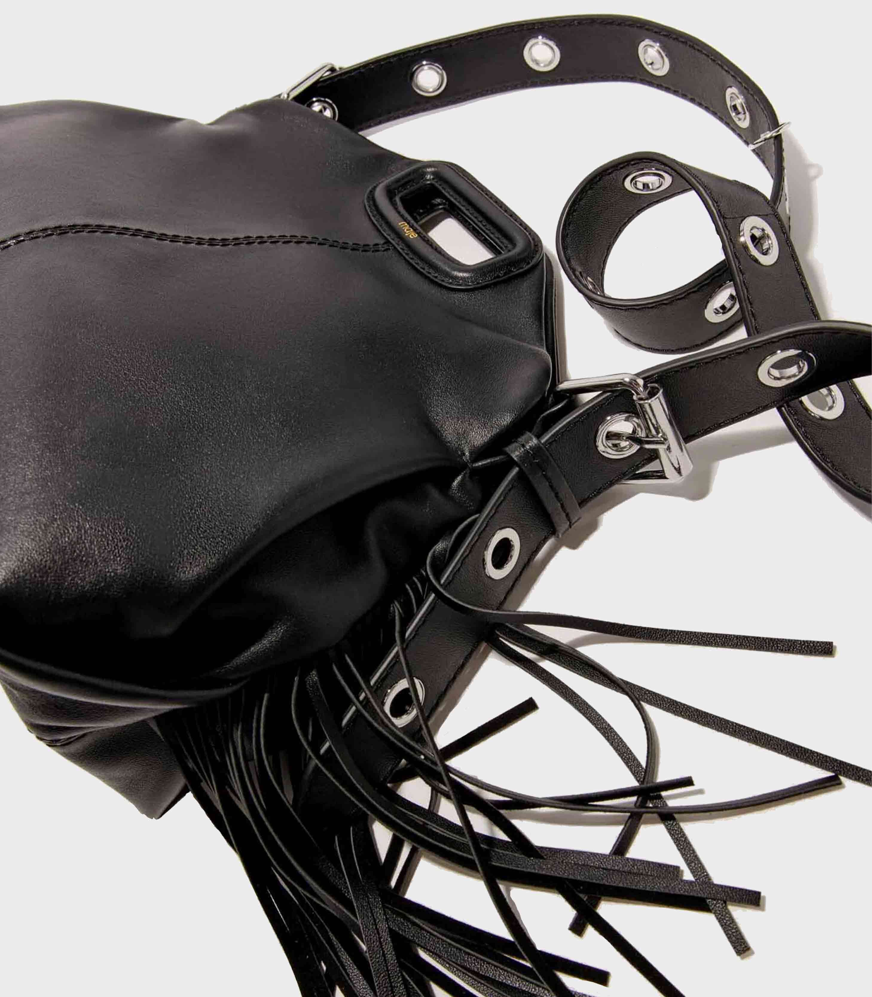 • The Miss M stands out as the statement accessory in the Maje wardrobe. Taking the codes of the classic M bag, rectangular handles, fringes, topstitching, it is available here in a smooth leather version, highlighted with gold metallic details. With its dual carrying options and signature finishes, it complements all styles, from the most metropolitan to the most casual.
