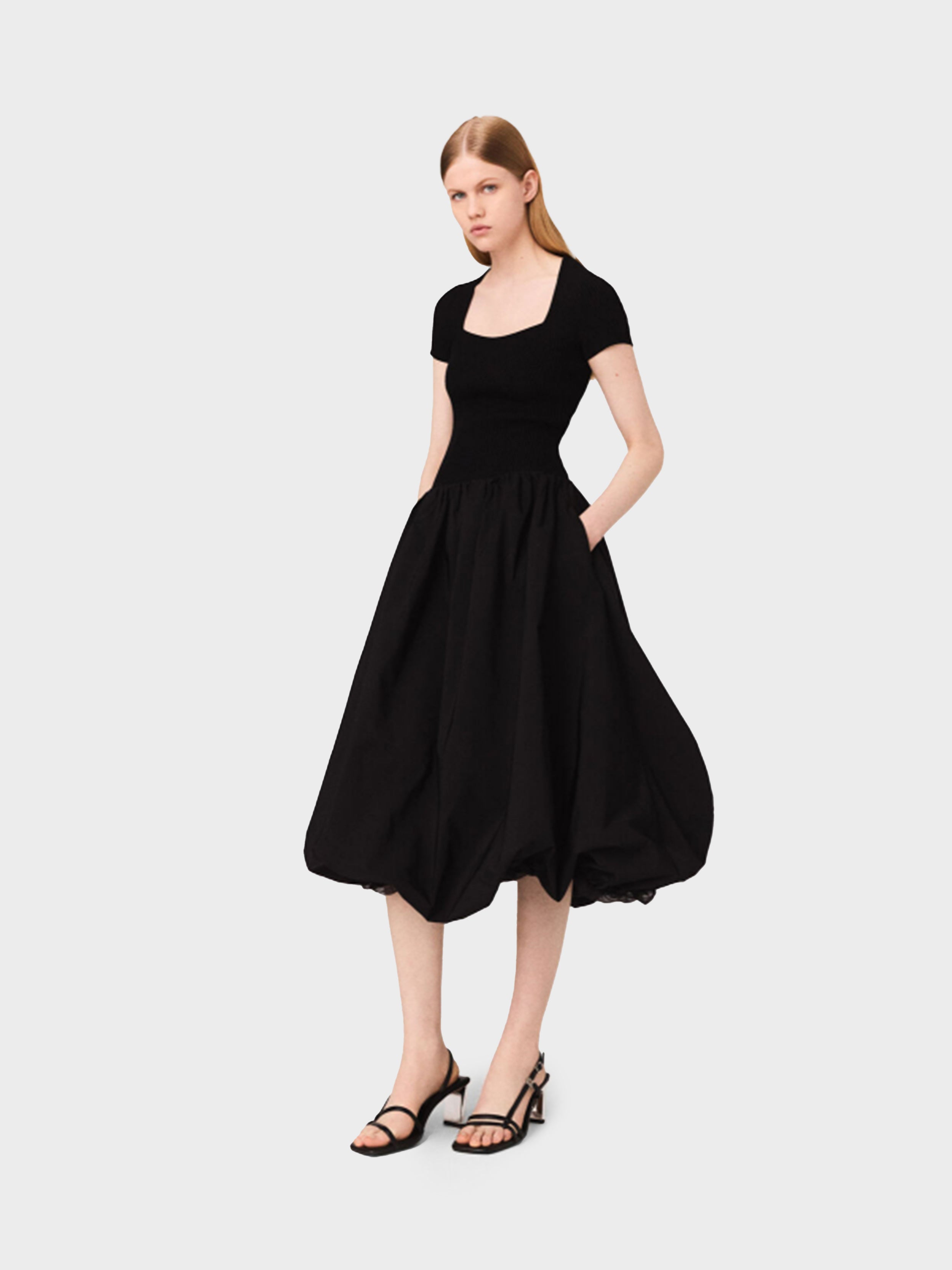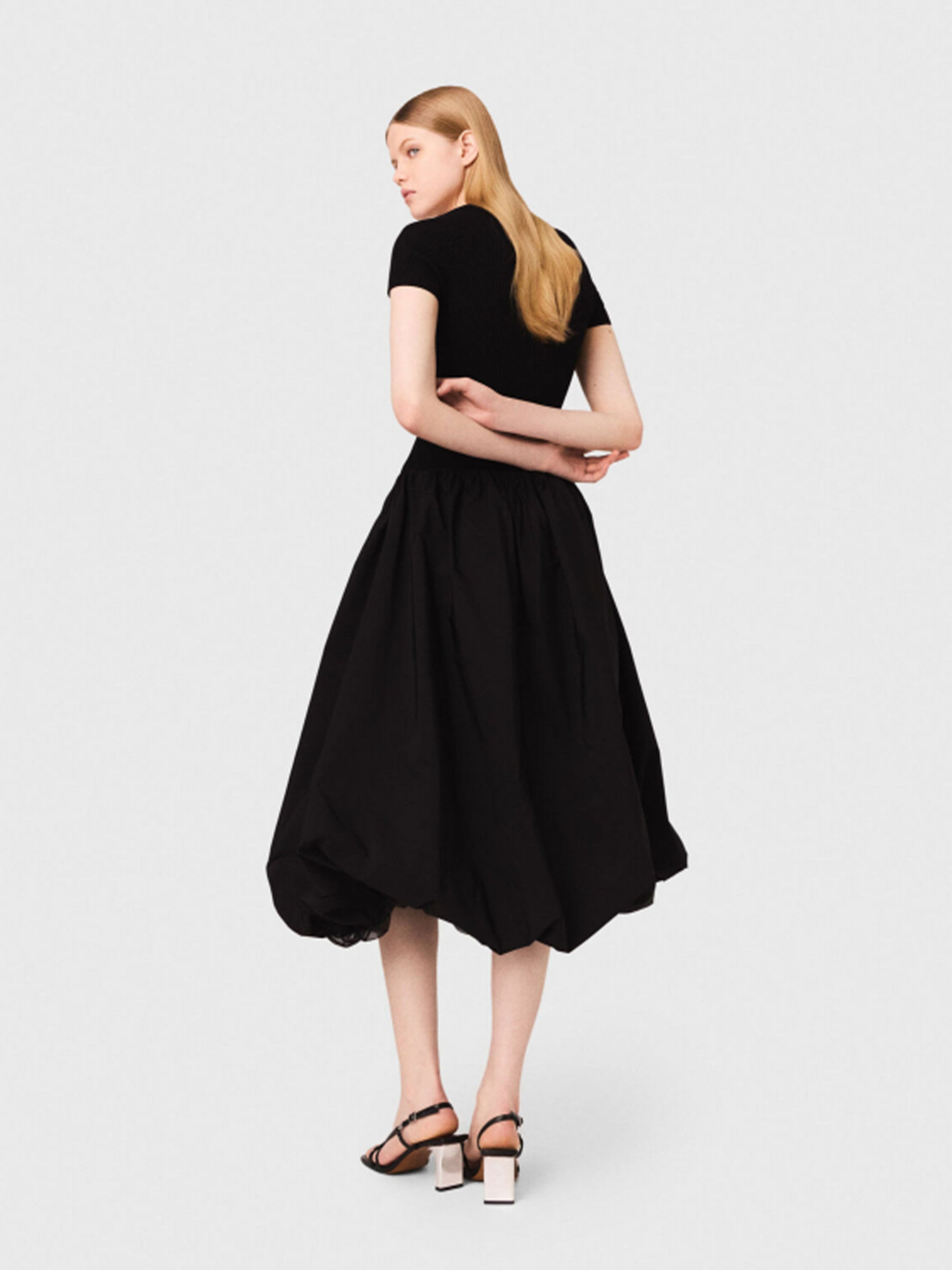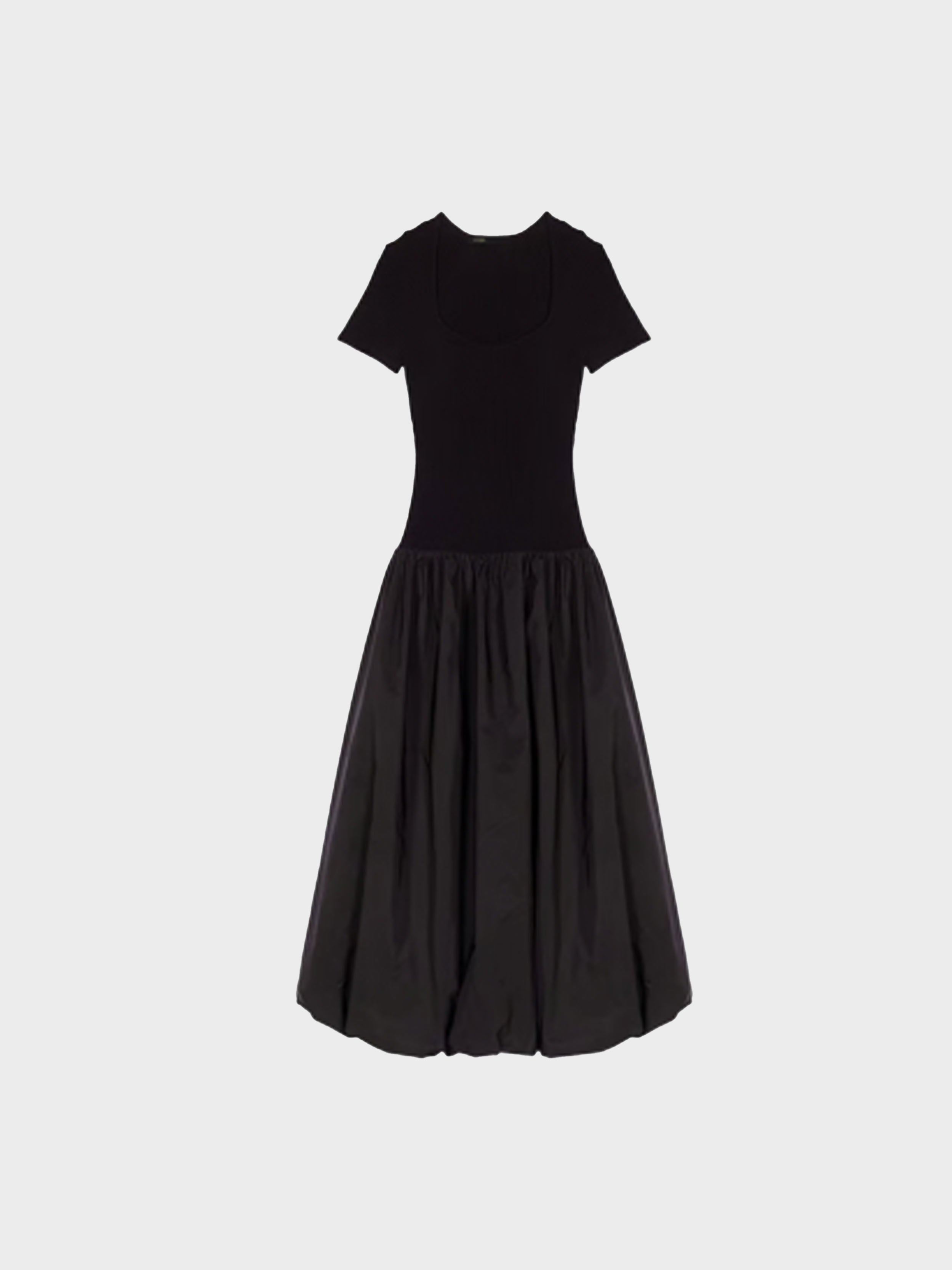 • This long dual-material dress combines the comfort of ribbed knit with the lightness and volume of taffeta. The top with a round neckline and short sleeves ensures a clean silhouette, while the voluminous taffeta skirt with a bubble effect creates a lovely contrast.