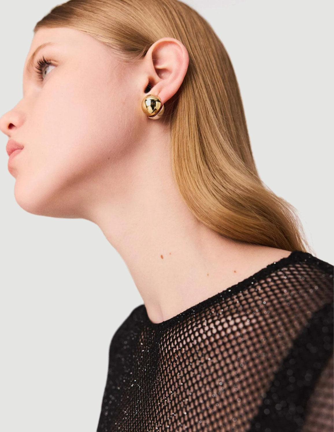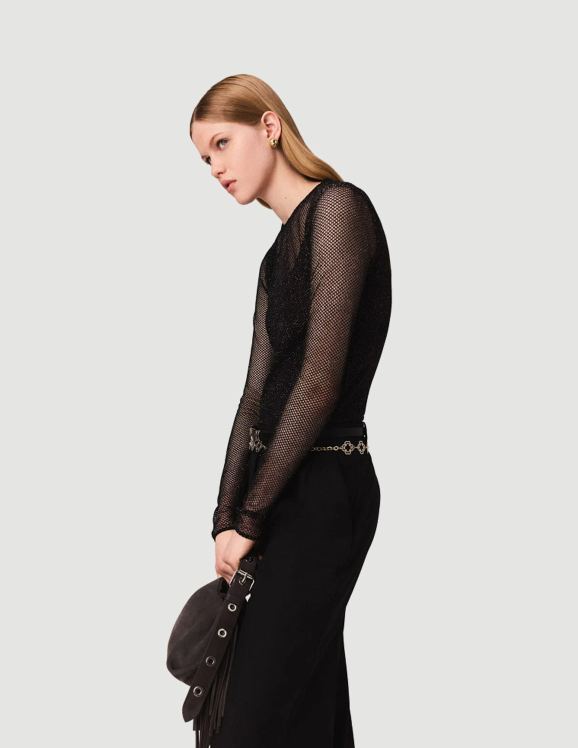 • This glitter mesh bodysuit stands out as a key piece in the collection. Its high neck and long sleeves add a sophisticated touch, while the tank top lining ensures comfort and fluidity. The glitter detail subtly enhances the silhouette with shine.