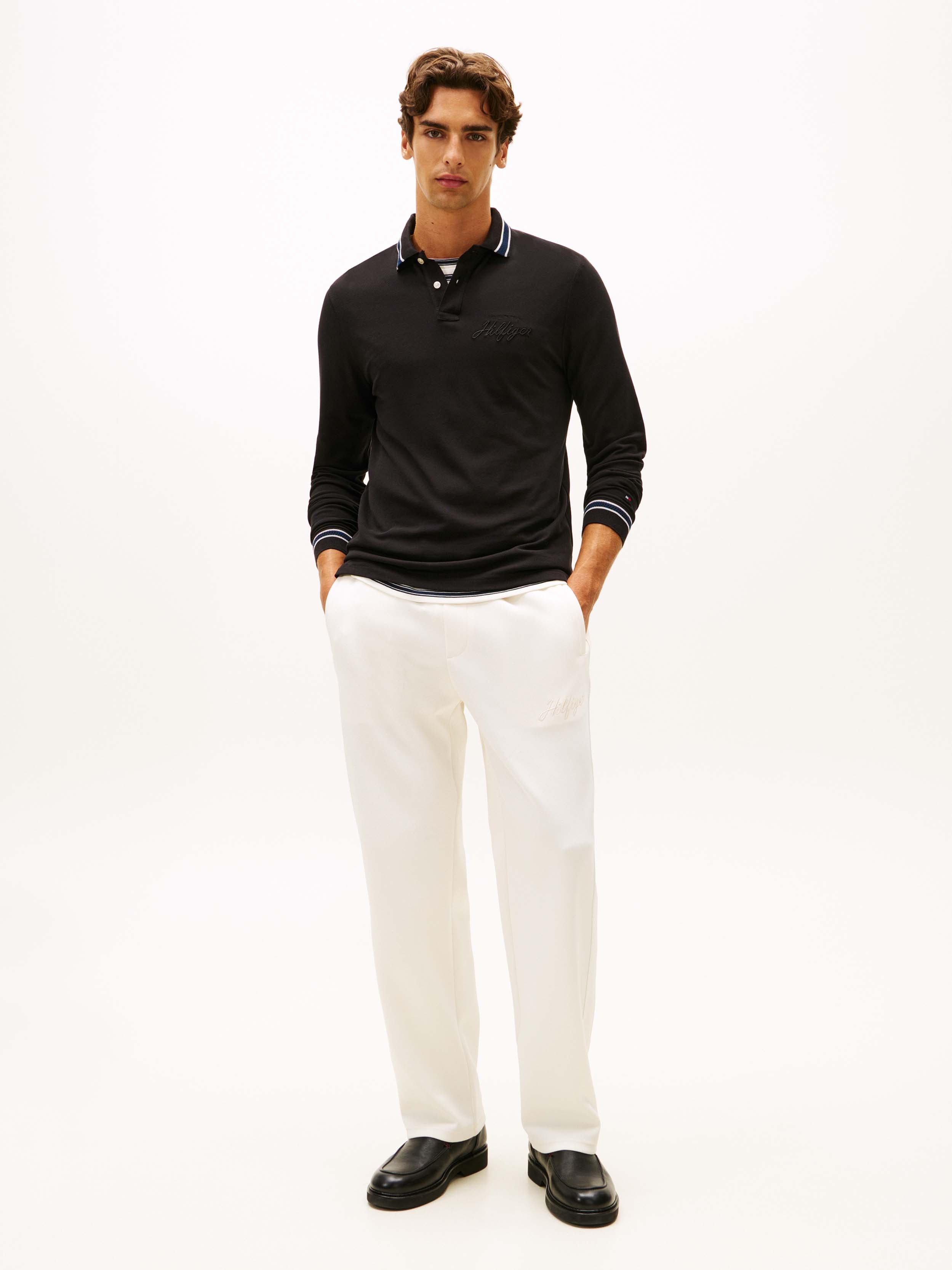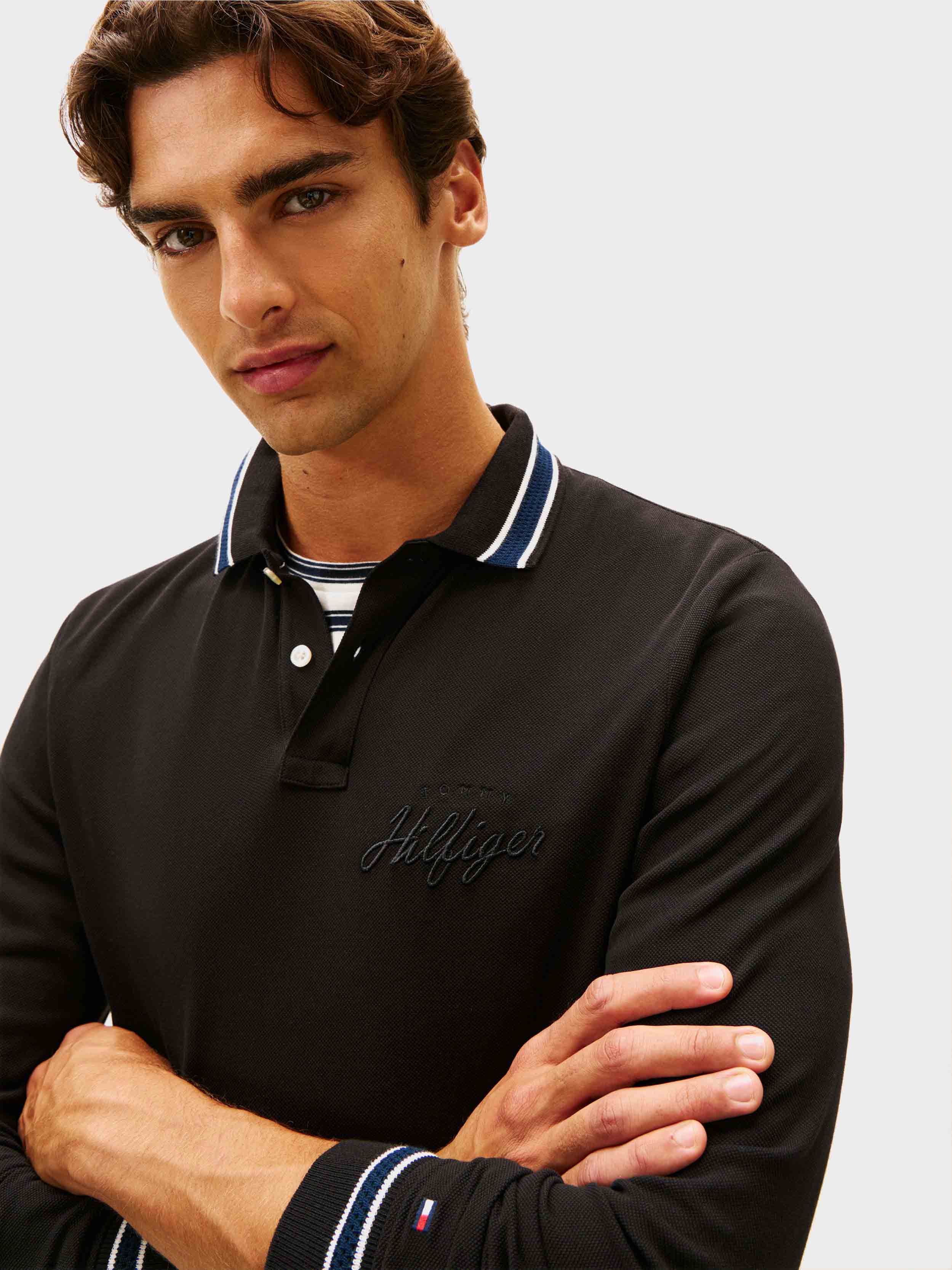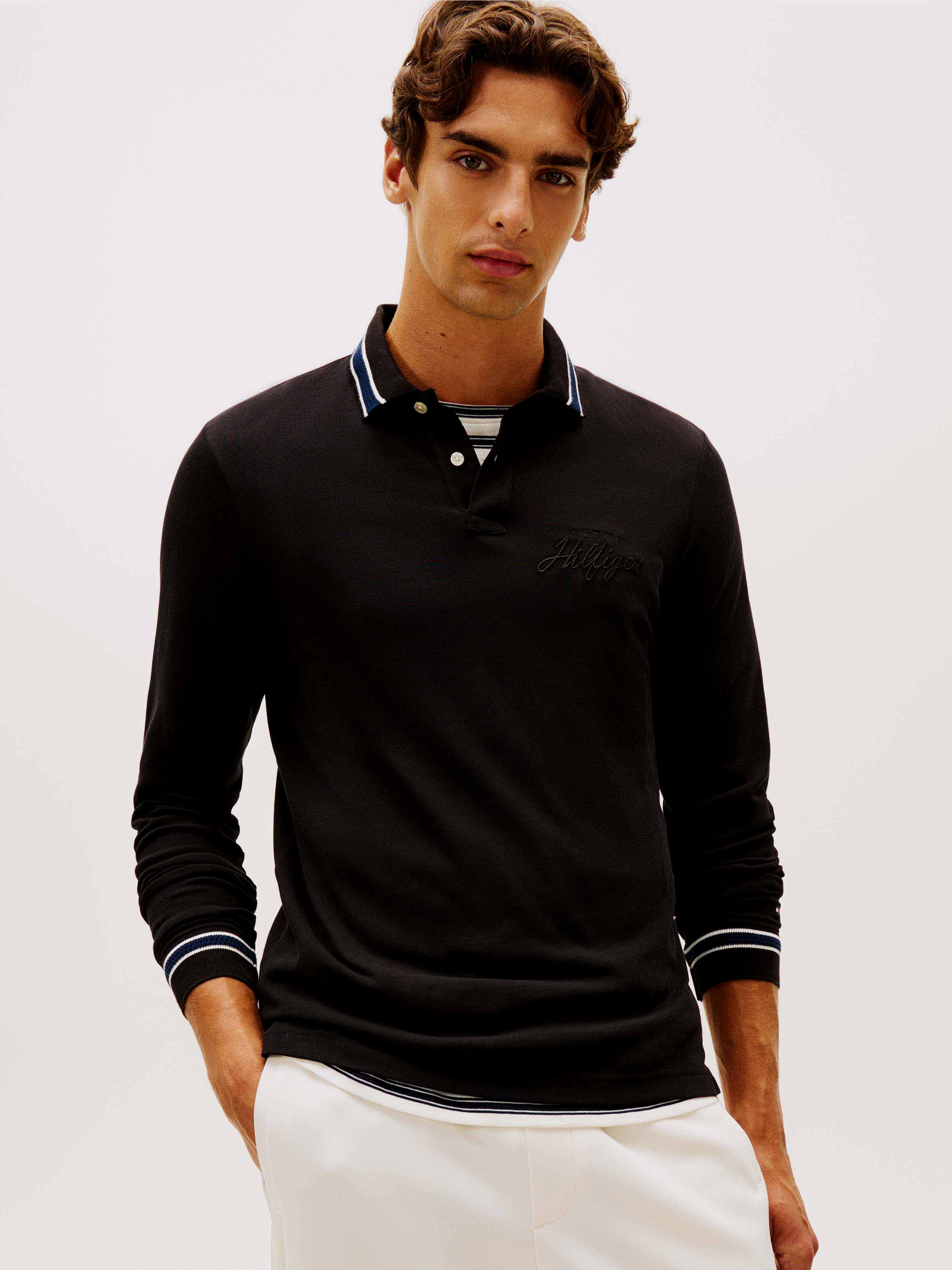 • Tommy Hilfiger men's polo. Our long-sleeve polo is made from a pique weave, known for its subtle, textured finish that adds dimension and breathability. The medium-weight stretch cotton provides the ideal balance of structure and softness with a lightweight feel that stays comfortable all day.