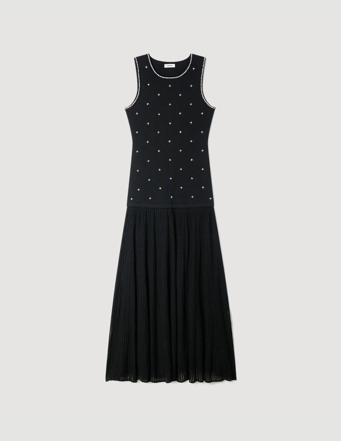 • Sleeveless 2-in-1 maxi dress featuring a rhinestone and bead-embellished knit top, a round neck and a flared, pleated skirt.
