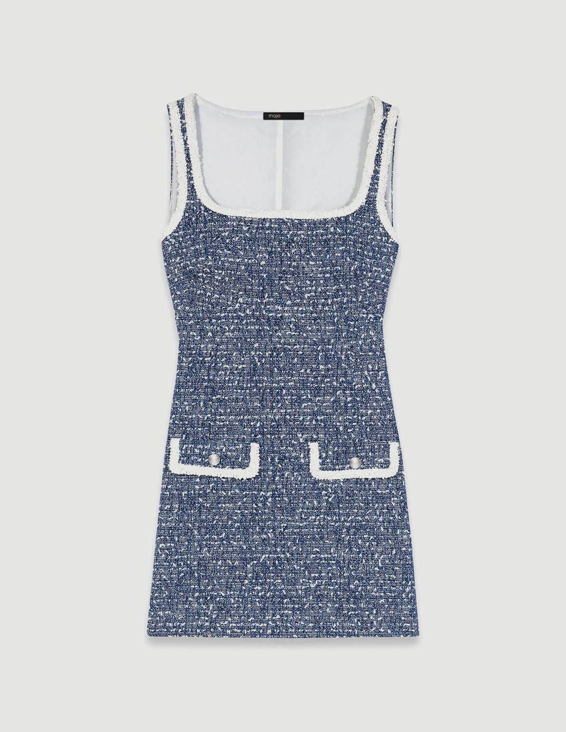 • This short dress, made from marled blue cotton tweed, features a straight, fitted cut, a square neckline and contrasting trim that accentuates every line. Two patch pockets, adorned with round silver-tone buttons, add a couture touch. The white lining and wide straps ensure comfort and support.