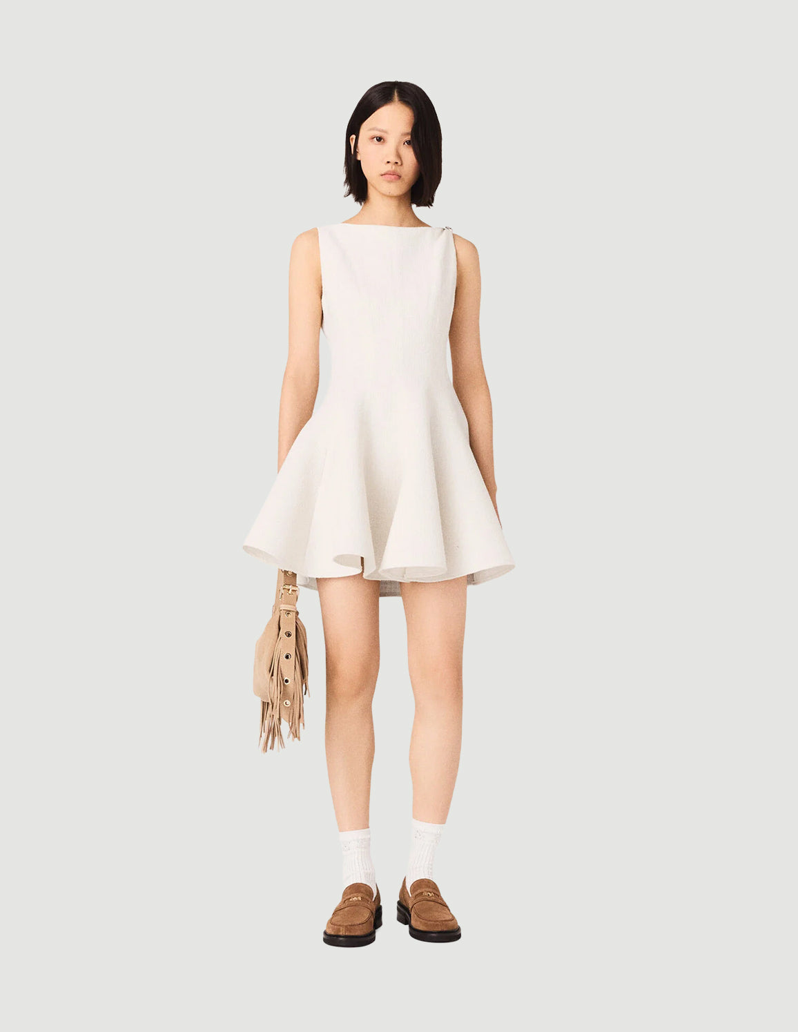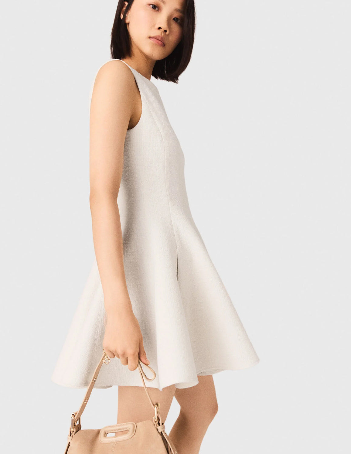 • Short flared ecru tweed-effect dress