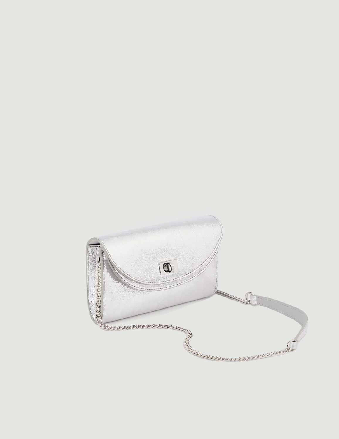• Metallic leather clutch with a double flap, swivel clasp and a chain strap for carrying by hand or across the body.