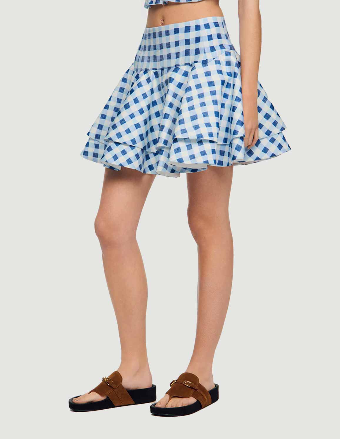 • Short gingham check skater skirt with layered ruffles.