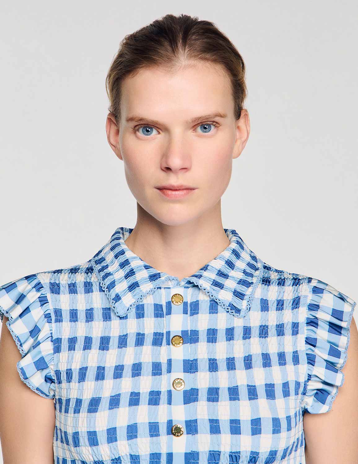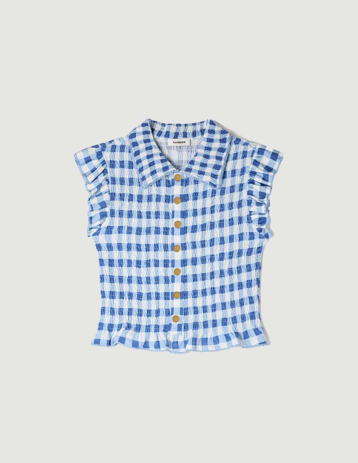 • Smocked gingham T-shirt featuring a shirt collar, ruffled short sleeves, decorative press-stud fastening and a ruffle on the hem.
