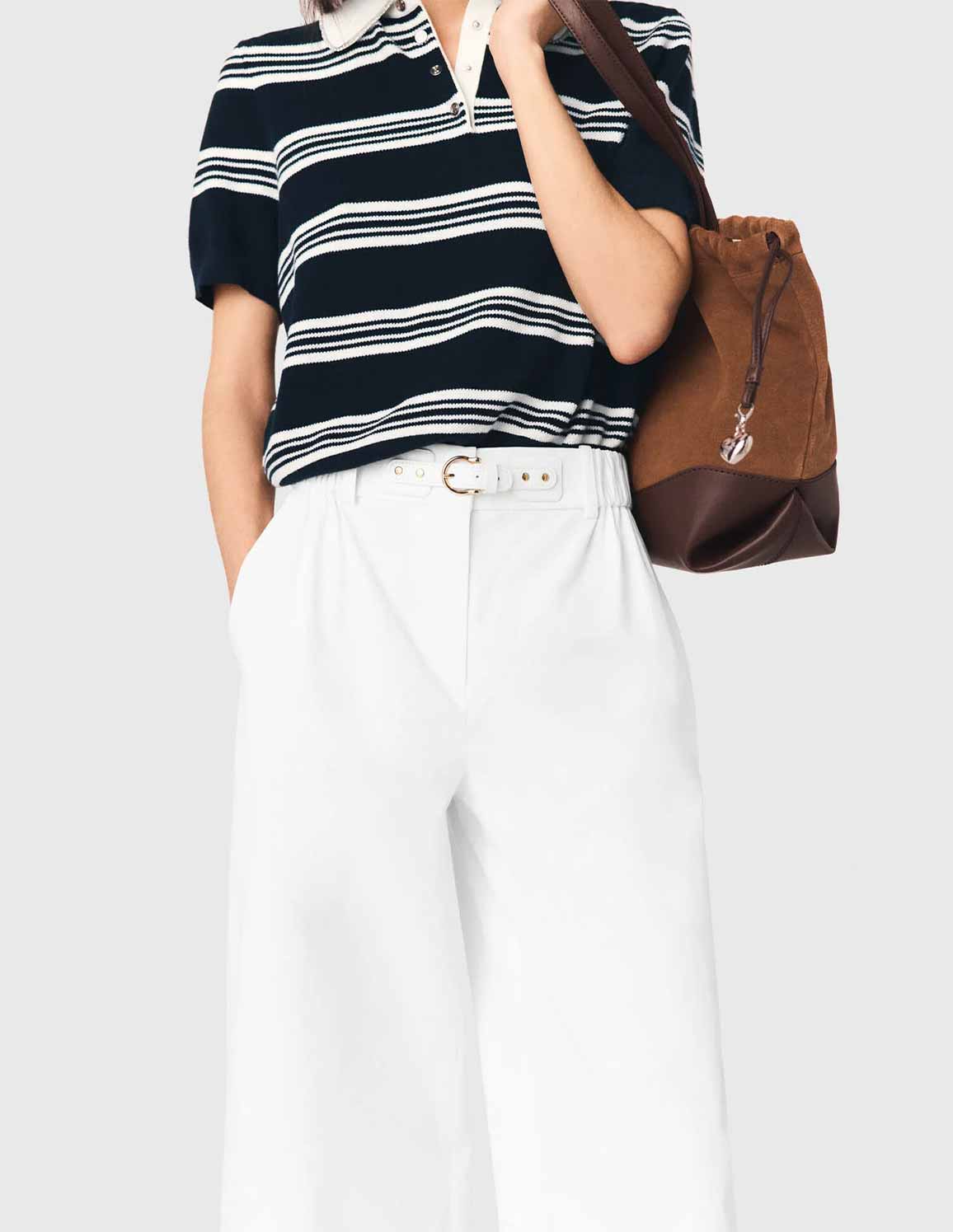 • These wide-leg white cotton trousers flatter the figure with their gathered high waist, flat front and thin belt, accentuated by a gold metal buckle and signature rivets. The Italian pockets and tonal topstitching combine functionality and sophistication for a look that is both structured and casual.