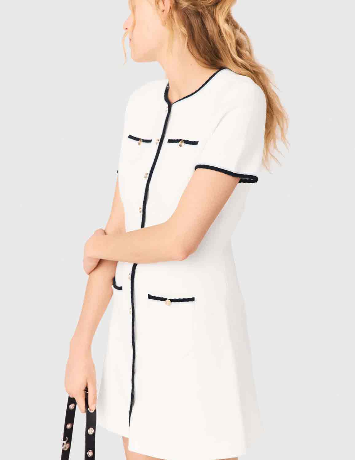 • This short, fitted knit dress has a silhouette structured by princess seams, a contrasting two-tone trim and gold-tone metal buttons with a crest motif. The four pockets give it a look that is both chic and functional.