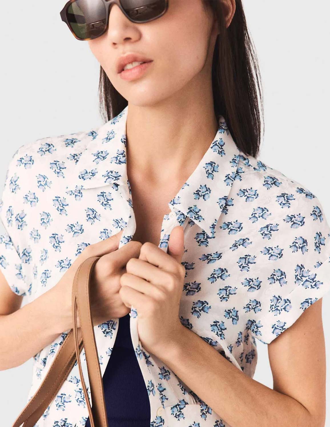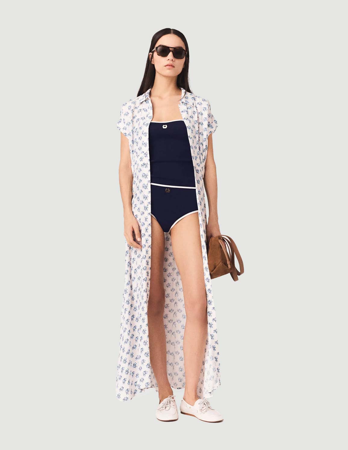 • On the French Riviera, the Maje woman asserts her modernity with retro influences and a sun-drenched look, where floral blue brings a fresh touch.