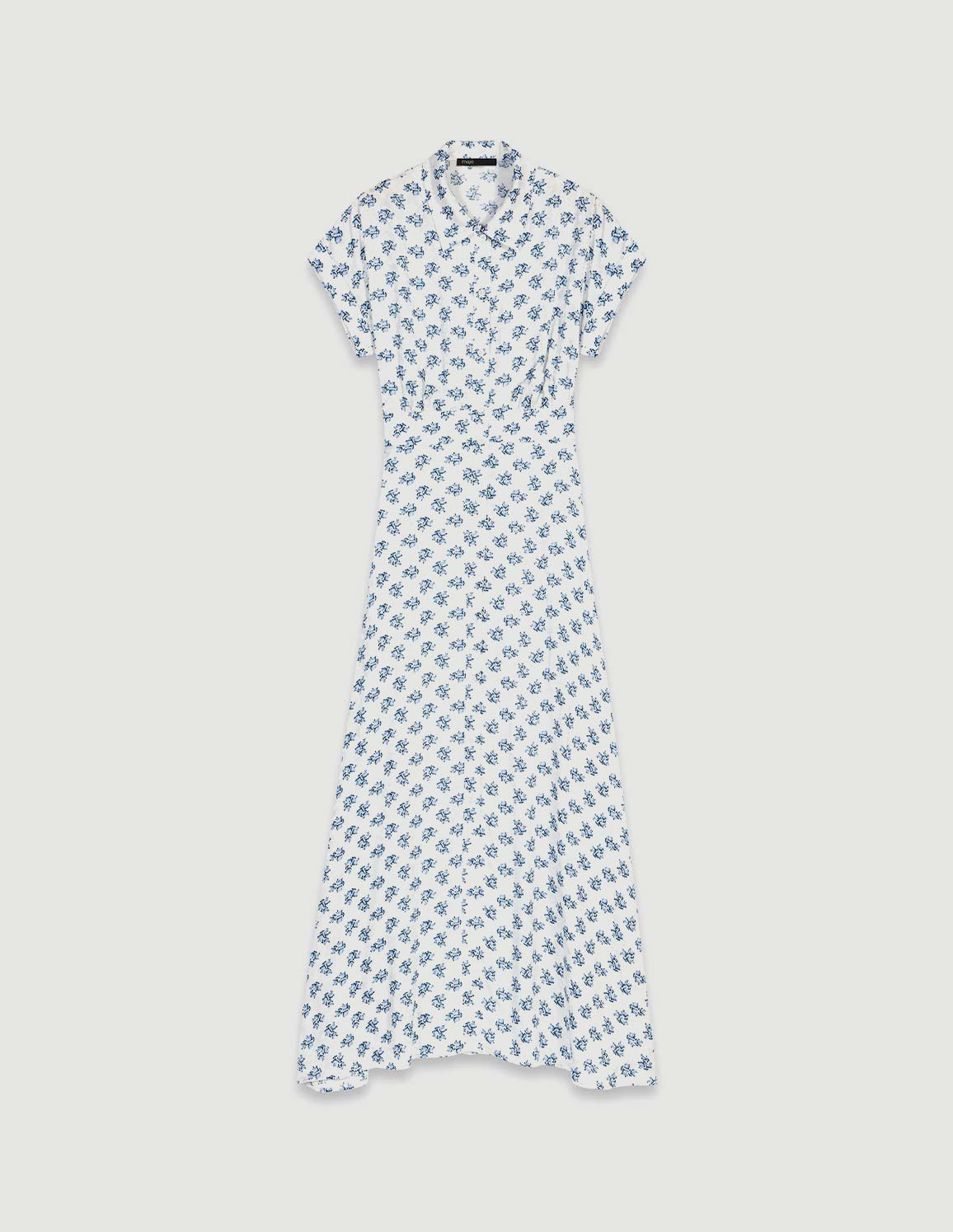 • This long, floaty yet structured dress is captivating with its blue floral bouquet print, a cinched waist that accentuates the figure, and elegant mother-of-pearl buttons on a delicate button placket.
