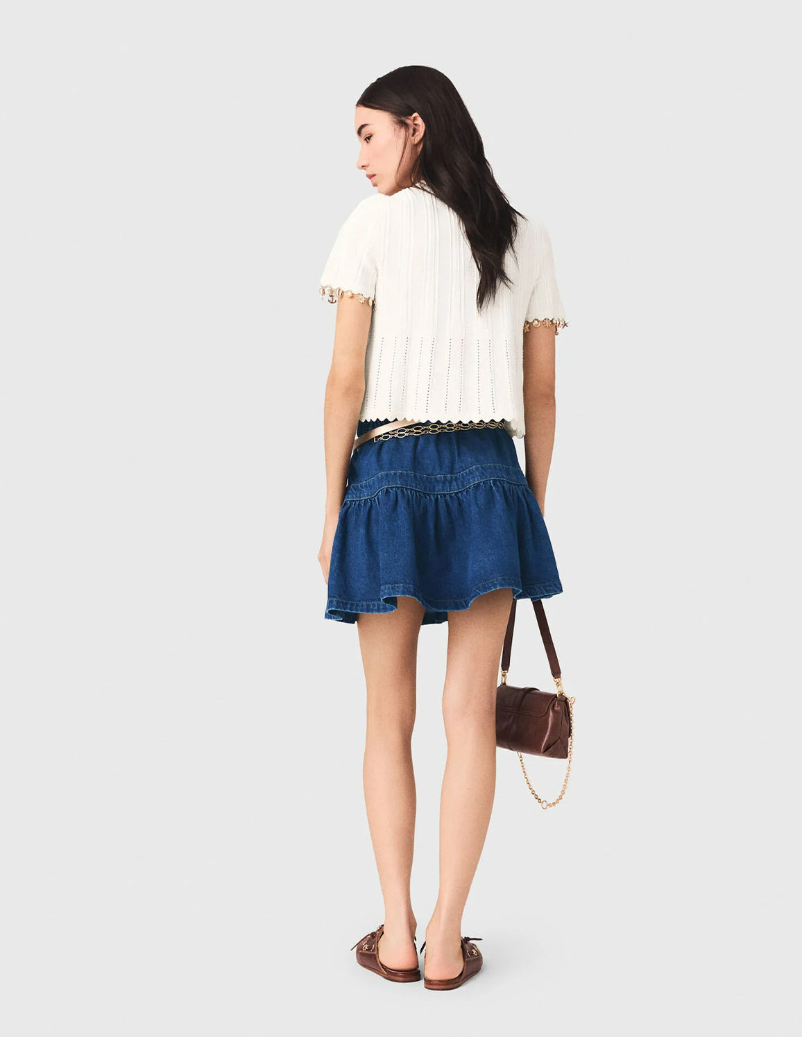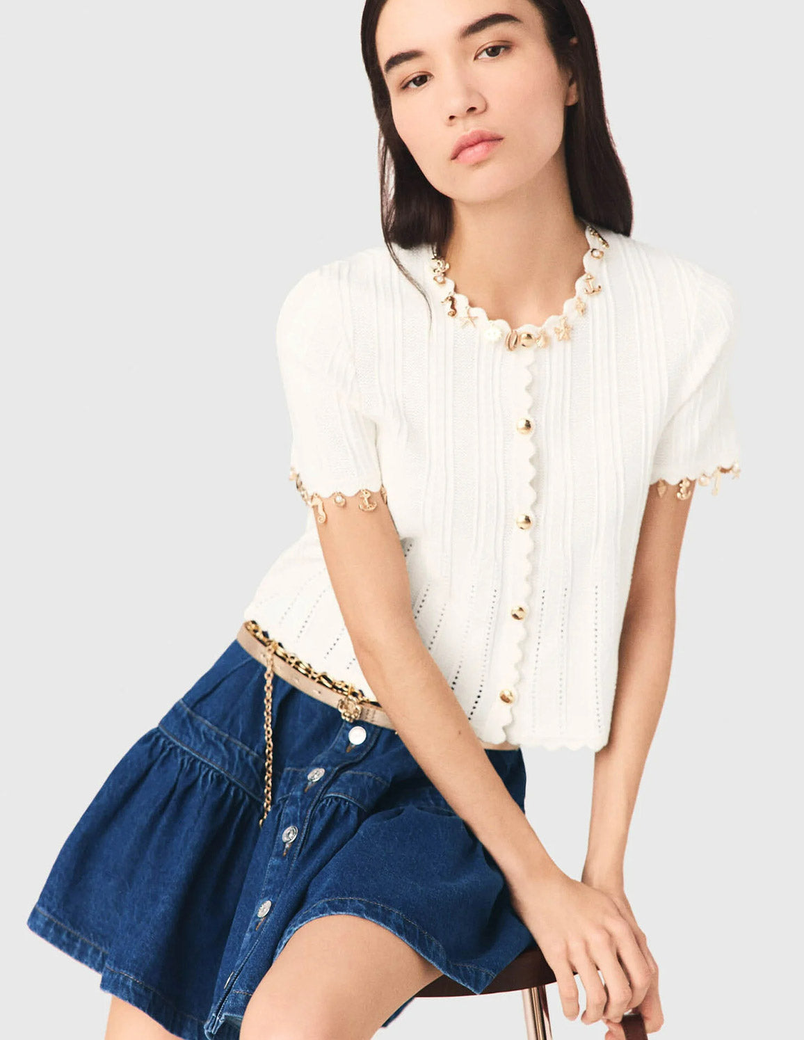 • Its fitted silhouette, highlighted by scalloped finishes, stands out with its ecru knit that plays on textures. A shower of golden charms—anchors, starfish and shells—illuminates the neckline and sleeves with a precious touch.